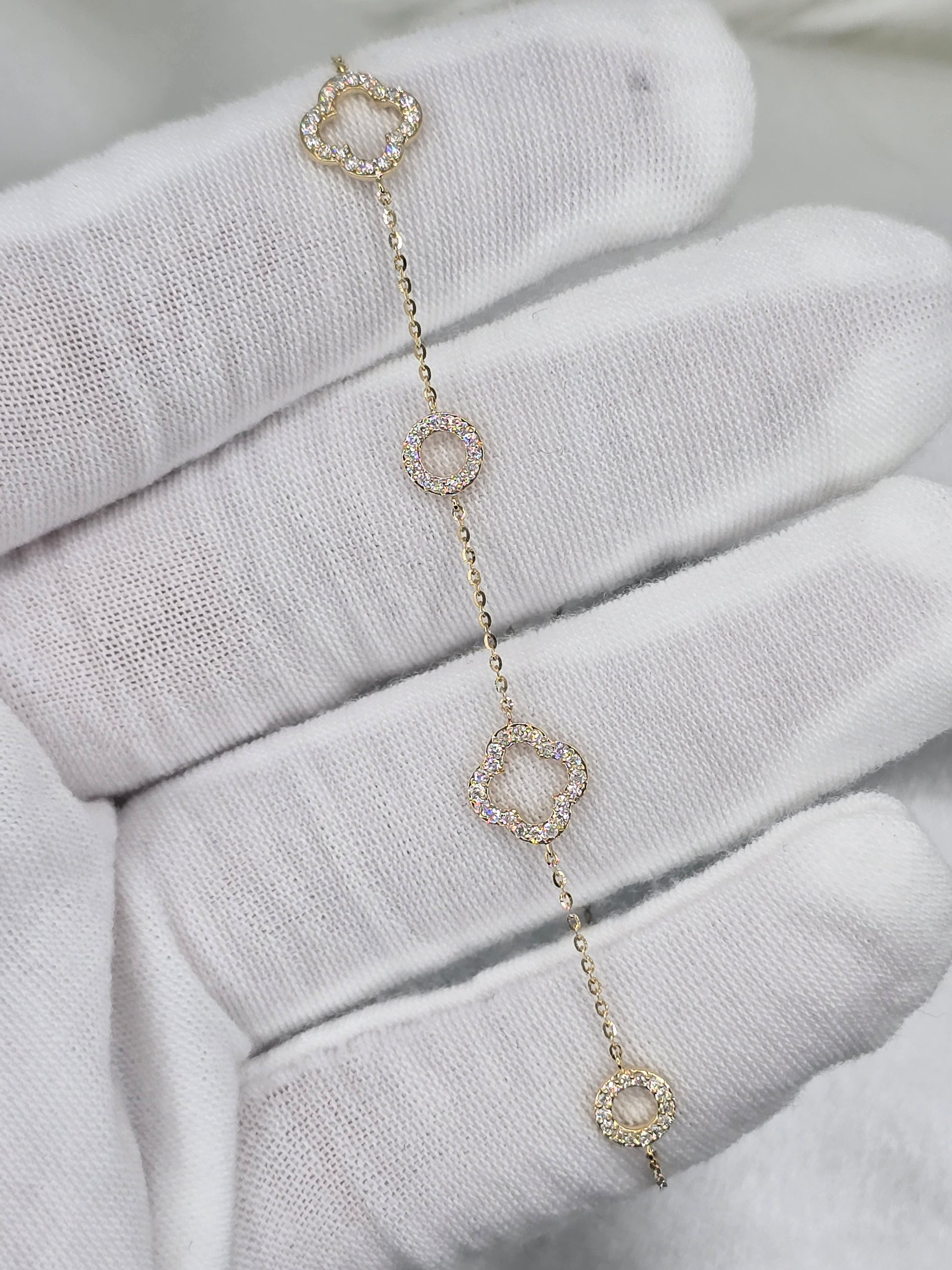 Elegant 14K yellow gold bracelet, featuring 0.34 carats of natural diamonds in a classic clover and circle design. Designed to fit wrists from 6.5" to 7.5", it offers a refined sparkle that complements any ensemble with timeless sophistication. Perfect for adding a subtle yet luxurious touch to your everyday style or special occasions.