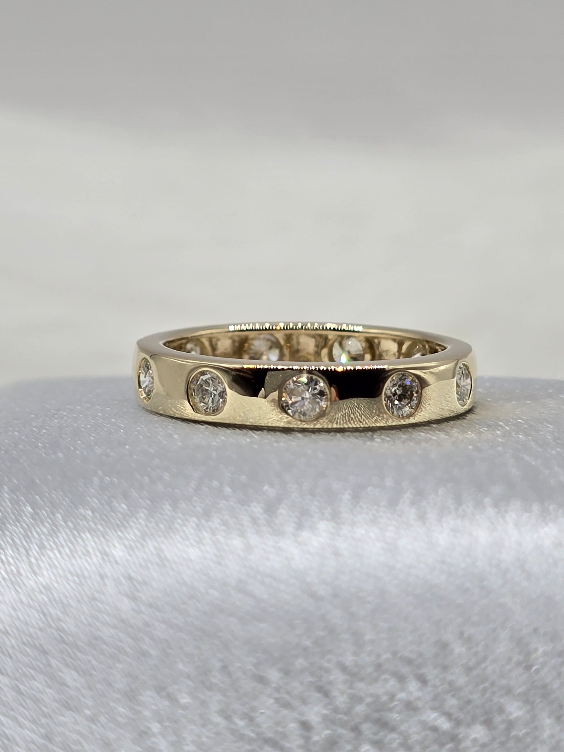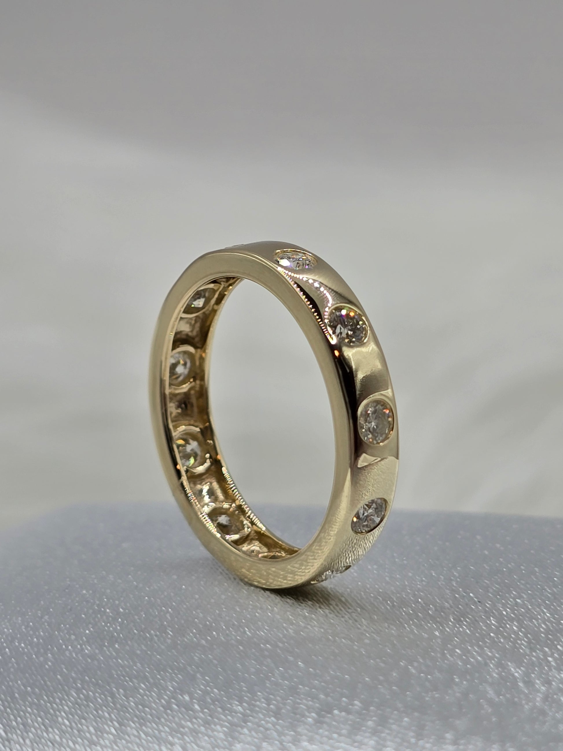 Crafted from 14K yellow gold, this eternity wedding band features natural diamond stations totaling 0.75 carats. Its wider design offers a bold yet elegant statement, combining durability with refined craftsmanship for lasting beauty.