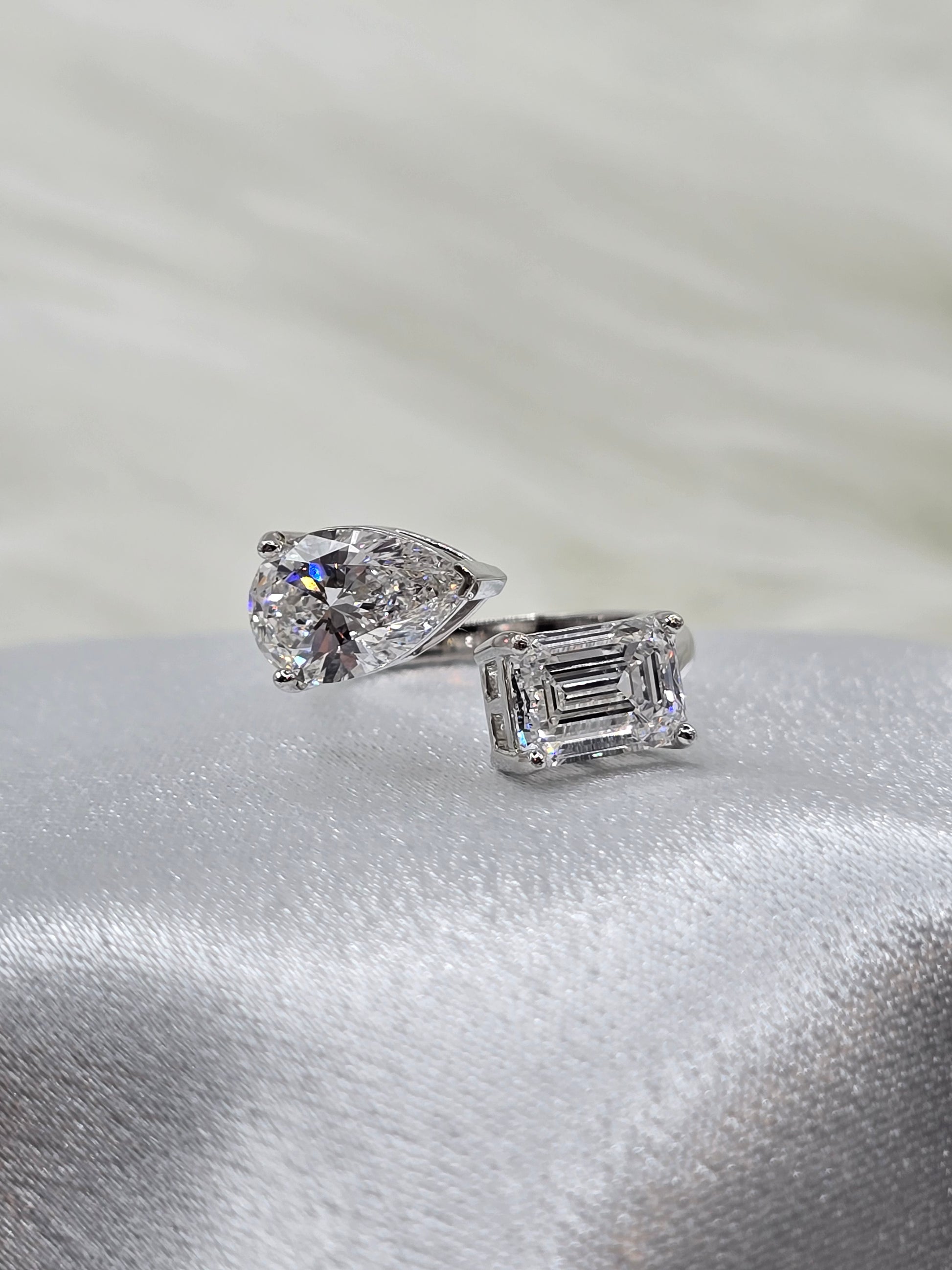 Experience timeless elegance with this 4 CTW Toi Et Moi bypass ring, featuring two IGI certified lab-grown diamonds of exceptional E color and VS clarity. Crafted in lustrous 14K white gold, its unique design symbolizes unity and balance, making it a perfect statement piece for any occasion. IGI certified for quality and authenticity, this ring offers both beauty and ethical assurance. Elevate your jewelry collection with a sophisticated blend of modern craftsmanship and classic charm.