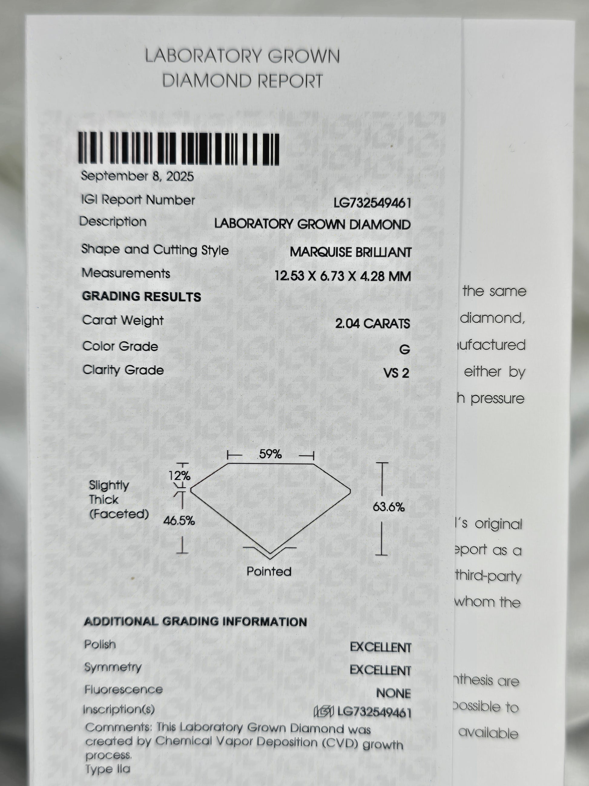 Loose 2.04 Ct G/VS2 Marquise Lab Diamond - IGI Certified