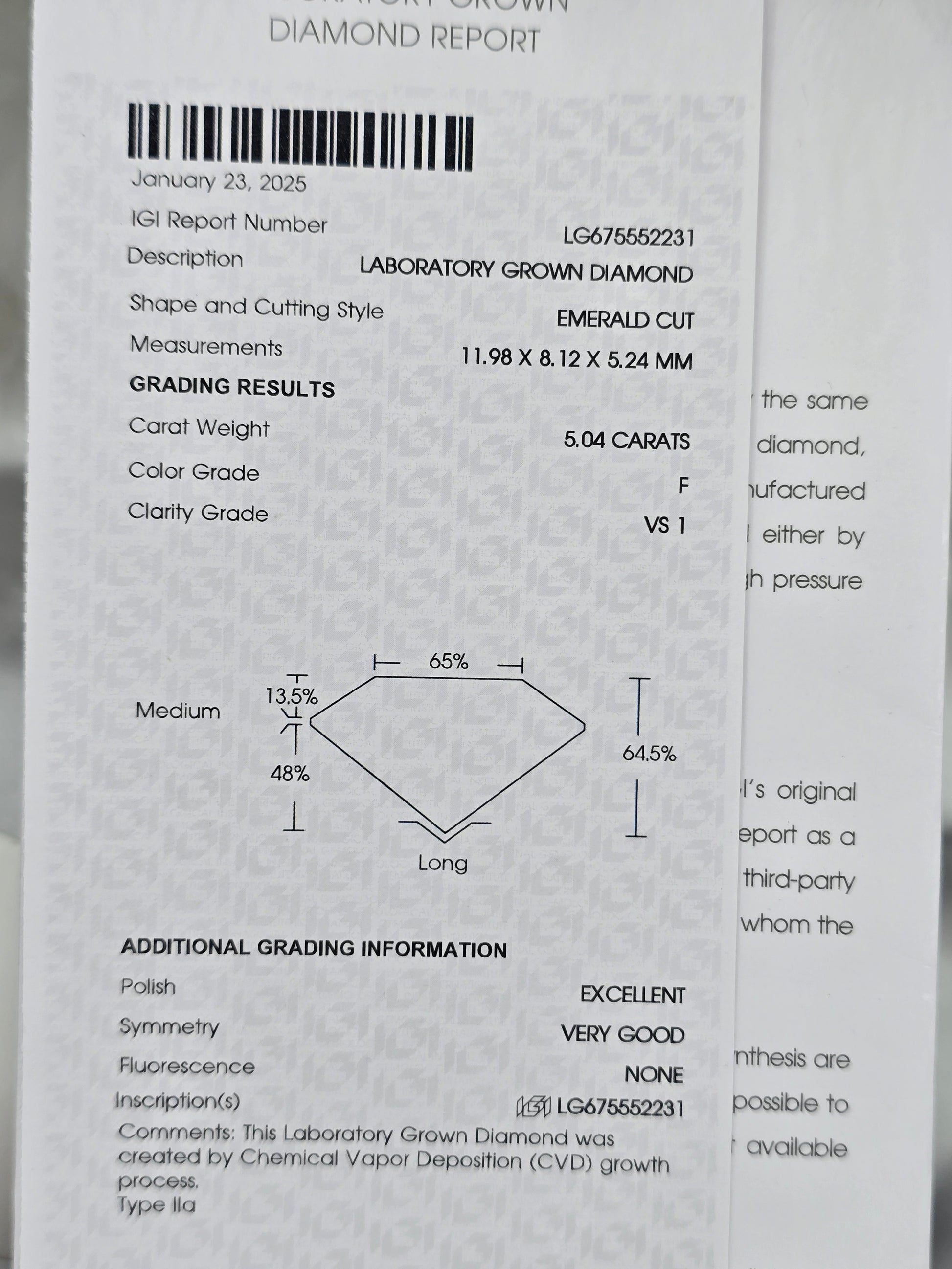 Loose 5.04 Ct F/VS1 Emerald Cut Lab Diamond - IGI Certified