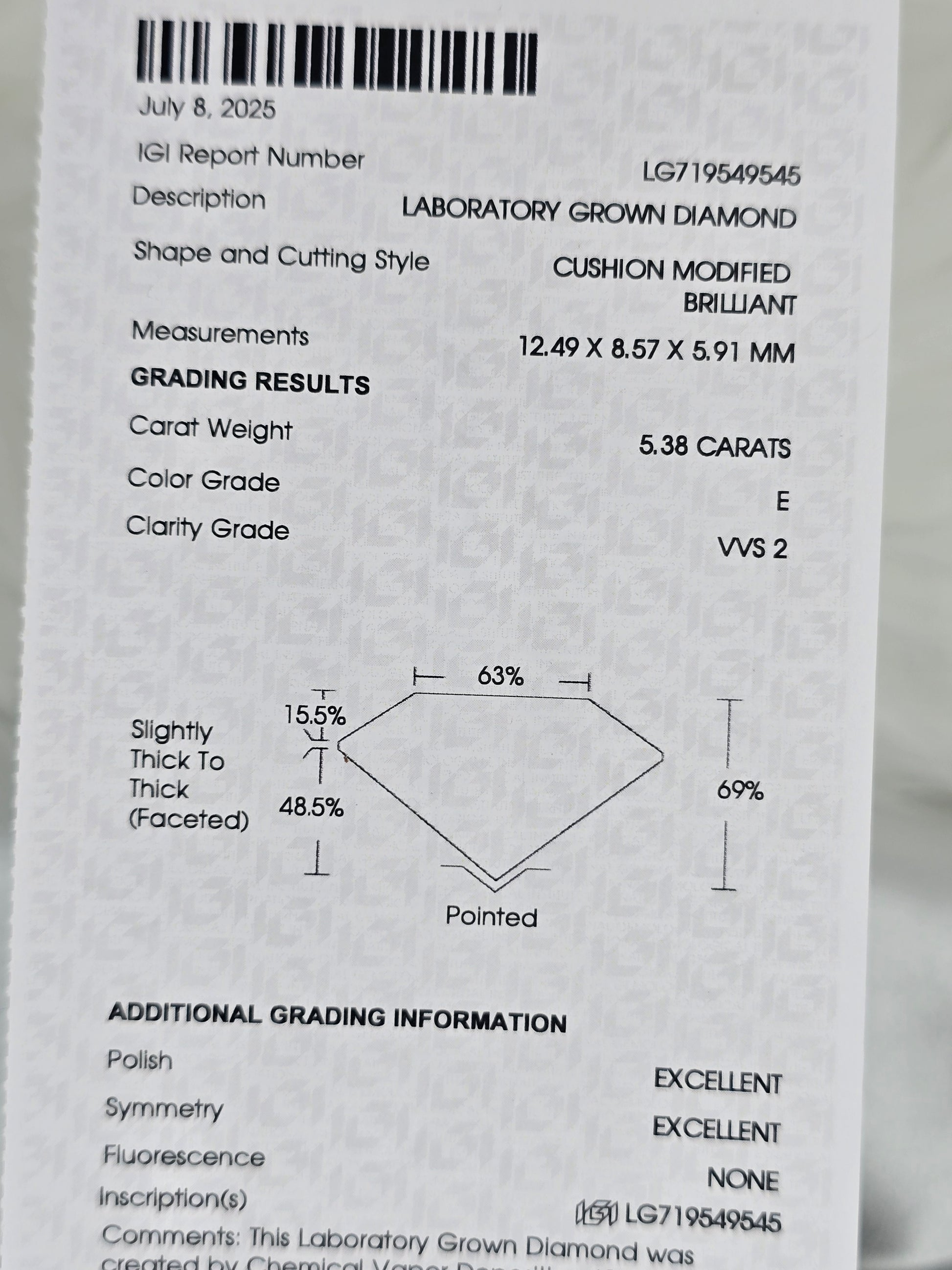 Loose 5.38 Ct E/VVS2 Elongated Cushion Lab Diamond - IGI Certified