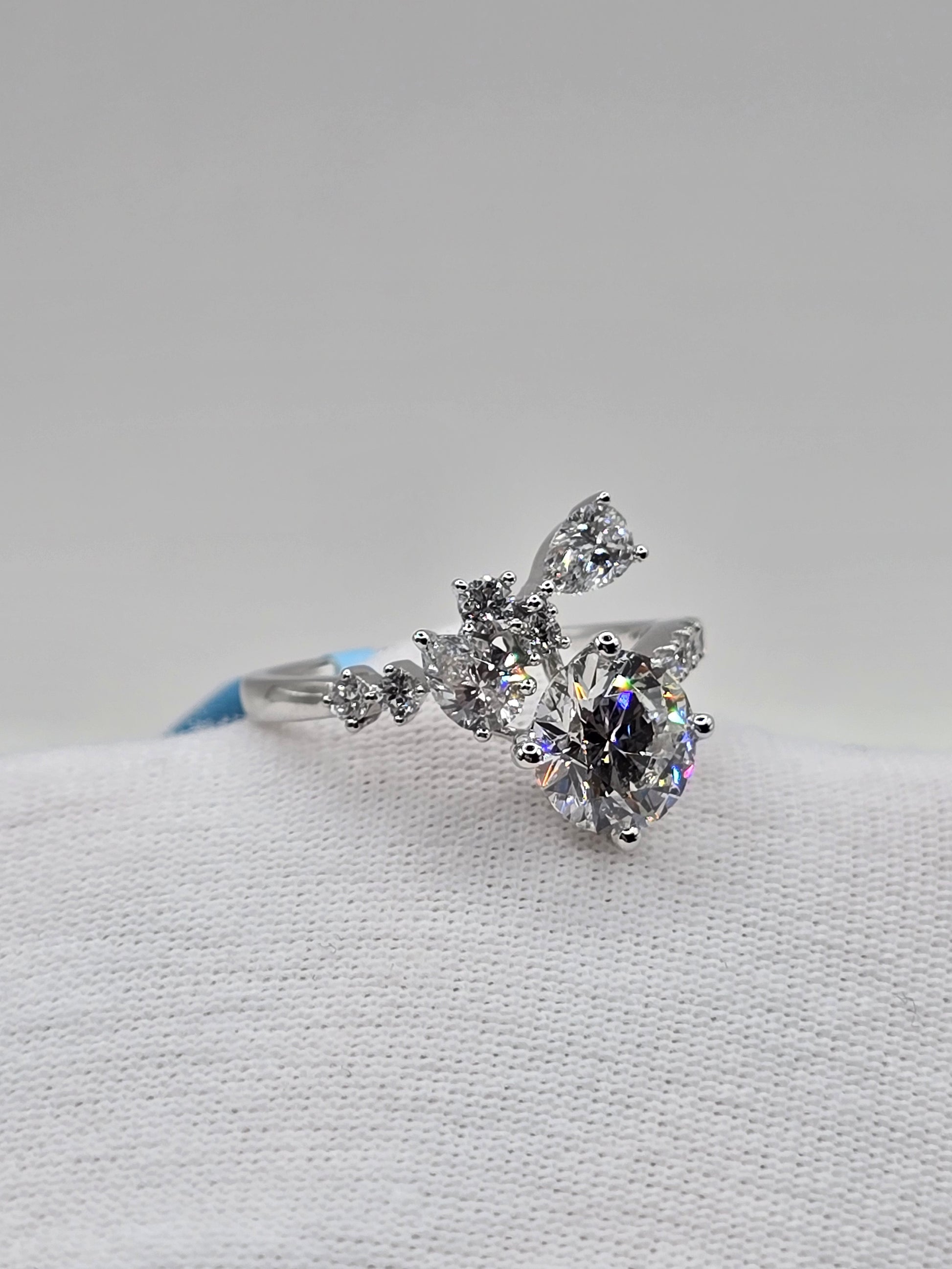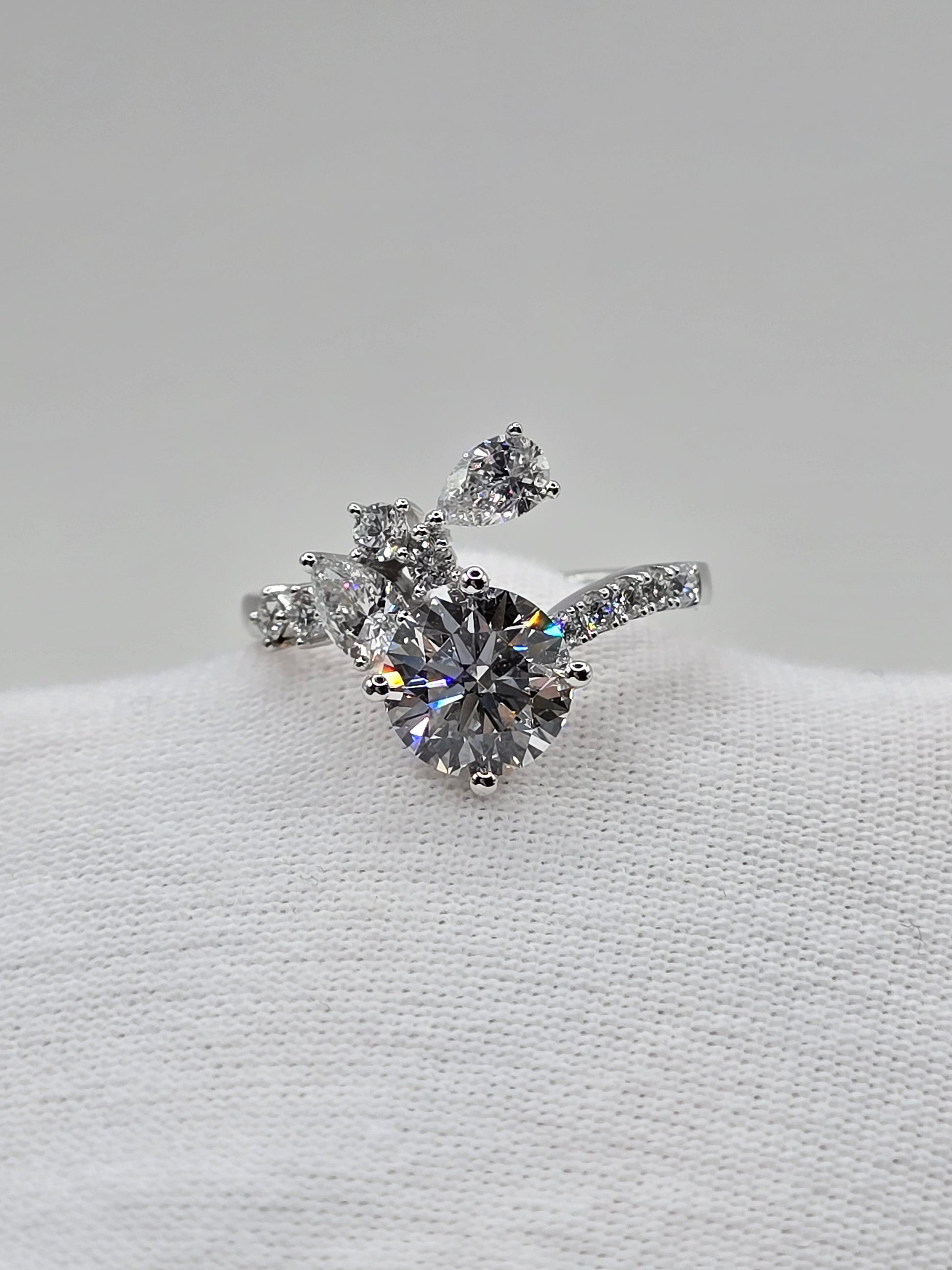 This striking 14K white gold ring showcases 2.50 CTW of lab grown diamonds with a dazzling 1.75 ct round brilliant lab diamond at its center. Its bold, modern design makes a powerful statement, perfect for those who dare to stand out—whether as an engagement ring or a standout right-hand piece. Crafted for brilliance and uniqueness, this ring redefines elegance with a fearless edge.